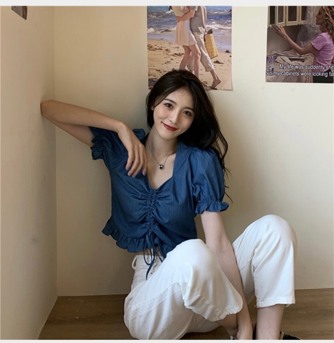 袖のクシャっとがお洒落♡半袖ブラウス♡ 韓国 トップス