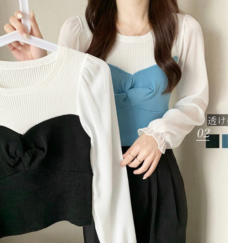 即納商品♡ ニットトップス 韓国 シフォン パフスリーブ